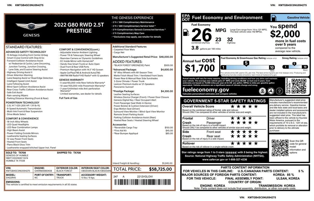 Genesis Certified with over 73,000 miles of Factory Warranty remaining! A CPO has more warranty than a new one; under the GENESIS CERTIFIED Program you get the remainder of the 10 YEAR/100,000 mile powertrain warranty AND IT EXTENDS THE BUMPER-TO-BUMPER WARRANTY TO 6YRS/75,000 miles from the in-service date that started on 12.28.2021. That is more than the 5/60 bumper-to-bumper warranty when it was new! You also receive; 3 years of Genesis Connected Services, 90 days XM, Rental Car Coverage, Towing & Travel Breakdown Coverage and free Roadside Assistance for 10 years. Click on ORIGINAL WINDOW STICKER on the Carfax to see all of the features. We have both remotes. Like new inside and out. Located at 20440 Interstate I-45 North, Spring, Tx minutes from The Woodlands, Tomball and Conroe. CALL US (346-589-8830) CLICK US (GenesisofSpring.com) or COME SEE US!!