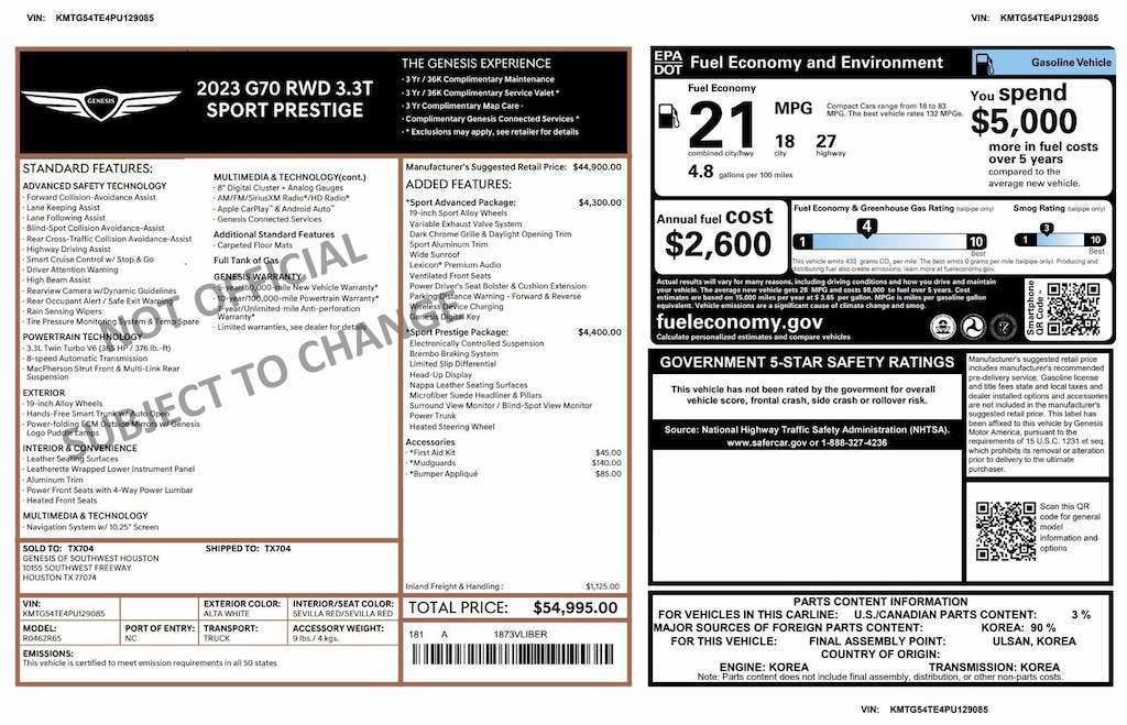 Genesis Certified with over 70,000 miles of Factory Warranty remaining! A CPO has more warranty than a new one; under the GENESIS CERTIFIED Program you get the remainder of the 10 YEAR/100,000 mile powertrain warranty AND IT EXTENDS THE BUMPER-TO-BUMPER WARRANTY TO 6YRS/75,000 miles from the in-service date that started on 08.04.2023. That is more than the 5/60 bumper-to-bumper warranty when it was new! You also receive; 3 years of Genesis Connected Services, 90 days XM, Rental Car Coverage, Towing & Travel Breakdown Coverage and free Roadside Assistance for 10 years. Click on ORIGINAL WINDOW STICKER on the Carfax to see all of the features. Clean Carfax. We have both remotes. Like new inside and out. Located at 20440 Interstate I-45 North, Spring, Tx minutes from The Woodlands, Tomball and Conroe. CALL US (346-589-8830) CLICK US (GenesisofSpring.com) or COME SEE US!!