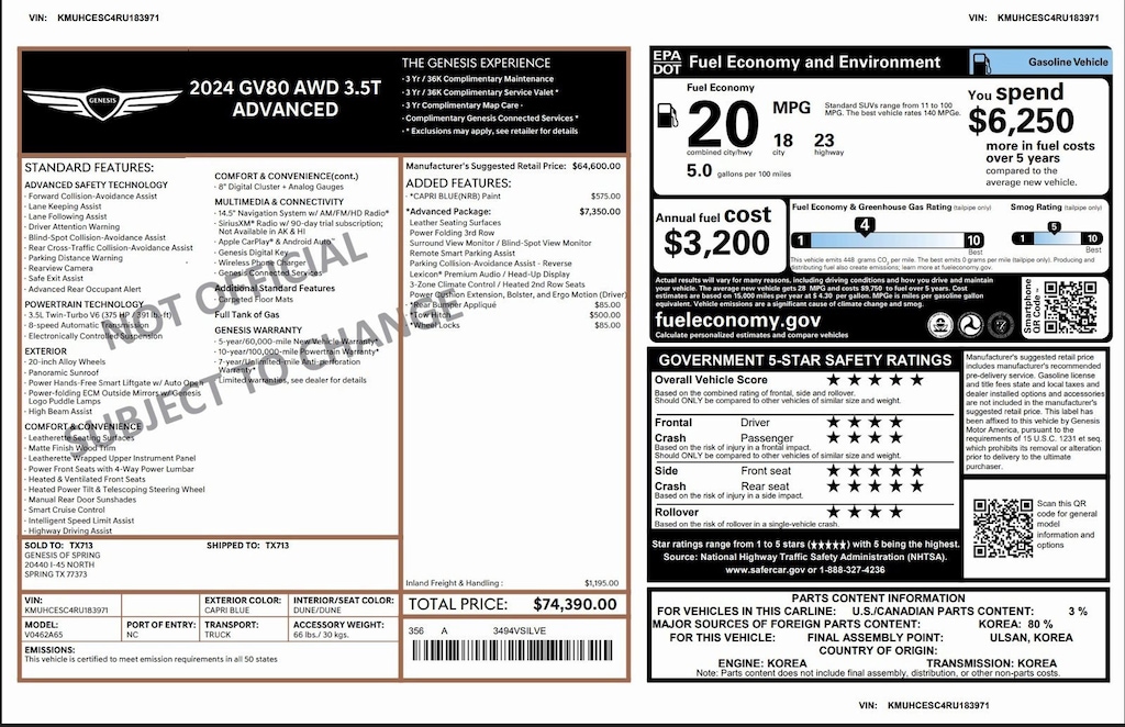 Genesis Certified with over 62,000 miles of Factory Warranty remaining! A CPO has more warranty than a new one; under the GENESIS CERTIFIED Program you get the remainder of the 10 YEAR/100,000 mile powertrain warranty AND IT EXTENDS THE BUMPER-TO-BUMPER WARRANTY TO 6YRS/75,000 miles from the in-service date that started on 03.25.2024. That is more than the 5/60 bumper-to-bumper warranty when it was new! You also receive; 3 years of Genesis Connected Services, 90 days XM, Rental Car Coverage, Towing & Travel Breakdown Coverage and free Roadside Assistance for 10 years. Click on ORIGINAL WINDOW STICKER on the Carfax to see all of the features. Clean Carfax. We have both remotes. Like new inside and out. Located at 20440 Interstate I-45 North, Spring, Tx minutes from The Woodlands, Tomball and Conroe. CALL US (346-589-8830) CLICK US (GenesisofSpring.com) or COME SEE US!!