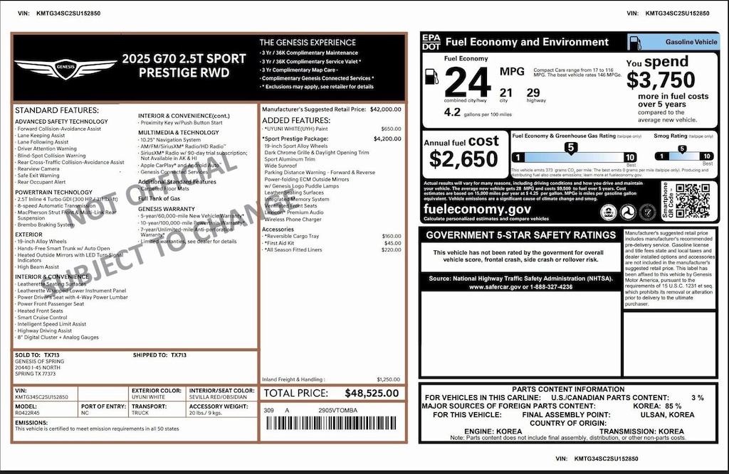 This Retired Courtesy Loaner is a Prestige model with over $4,000 in options, and it is Genesis Certified with over 95,000 miles of Factory Warranty remaining! A CPO has more warranty than a new one; under the GENESIS CERTIFIED Program you get the remainder of the 10 YEAR/100,000 mile powertrain warranty AND IT EXTENDS THE BUMPER-TO-BUMPER WARRANTY TO 6YRS/75,000 miles from the in-service date that started on 01.02.2025. That is more than the 5/60 bumper-to-bumper warranty when it was new! You also receive; 3 years of Genesis Connected Services, 90 days XM, Rental Car Coverage, Towing & Travel Breakdown Coverage and free Roadside Assistance for 10 years. Click on ORIGINAL WINDOW STICKER on the Carfax to see all of the features. Although it is being sold as used, it has never been titled. Clean Carfax. We have both remotes. Like new inside and out. Located at 20440 Interstate I-45 North, Spring, Tx minutes from The Woodlands, Tomball and Conroe. CALL US (346-589-8830) CLICK US (GenesisofSpring.com) or COME SEE US!!
