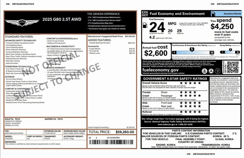 This Retired Courtesy Loaner is Genesis Certified with over 94,000 miles of Factory Warranty remaining! A CPO has more warranty than a new one; under the GENESIS CERTIFIED Program you get the remainder of the 10 YEAR/100,000 mile powertrain warranty AND IT EXTENDS THE BUMPER-TO-BUMPER WARRANTY TO 6YRS/75,000 miles from the in-service date that started on 02.28.2025. That is more than the 5/60 bumper-to-bumper warranty when it was new! You also receive; 3 years of Genesis Connected Services, 90 days XM, Rental Car Coverage, Towing & Travel Breakdown Coverage and free Roadside Assistance for 10 years. Click on ORIGINAL WINDOW STICKER on the Carfax to see all of the features. Although it is being sold as used, it has never been titled. Clean Carfax. We have both remotes. Like new inside and out. Located at 20440 Interstate I-45 North, Spring, Tx minutes from The Woodlands, Tomball and Conroe. CALL US (346-589-8830) CLICK US (GenesisofSpring.com) or COME SEE US!!