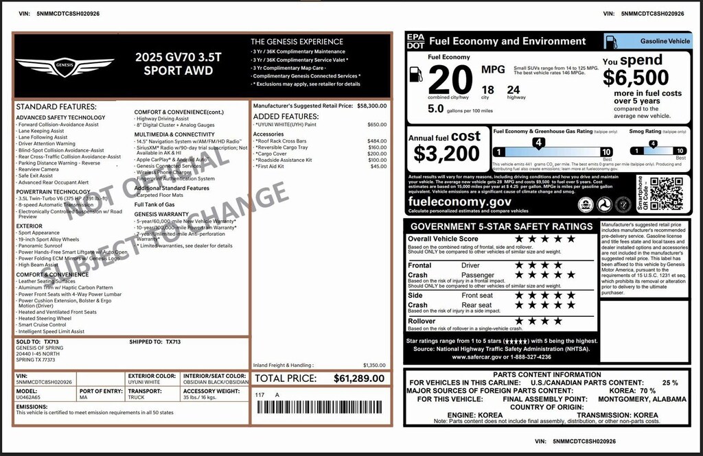 Genesis Certified with over 94,000 miles of Factory Warranty remaining! A CPO has more warranty than a new one; under the GENESIS CERTIFIED Program you get the remainder of the 10 YEAR/100,000 mile powertrain warranty AND IT EXTENDS THE BUMPER-TO-BUMPER WARRANTY TO 6YRS/75,000 miles from the in-service date that started on 01.02.2025. That is more than the 5/60 bumper-to-bumper warranty when it was new! You also receive; 3 years of Genesis Connected Services, 90 days XM, Rental Car Coverage, Towing & Travel Breakdown Coverage and free Roadside Assistance for 10 years. Click on ORIGINAL WINDOW STICKER on the Carfax to see all of the features. Although it is being sold as used, it has never been titled. Clean Carfax. We have both remotes. Like new inside and out. Located at 20440 Interstate I-45 North, Spring, Tx minutes from The Woodlands, Tomball and Conroe. CALL US (346-589-8830) CLICK US (GenesisofSpring.com) or COME SEE US!!Located at 20440 Interstate I-45 North, Spring, Tx minutes from The Woodlands, Tomball and Conroe. CALL US (346-589-8830) CLICK US (GenesisofSpring.com) or COME SEE US!!