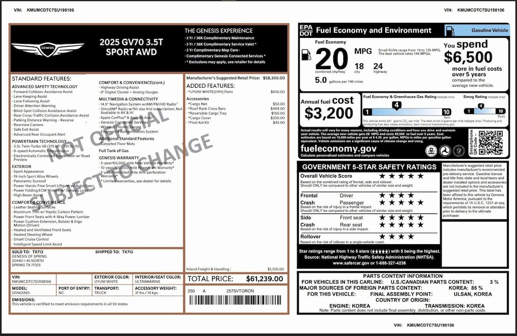 This Retired Courtesy Loaner is the well appointed Sport model, and is Genesis Certified with over 92,000 miles of Factory Warranty remaining! A CPO has more warranty than a new one; under the GENESIS CERTIFIED Program you get the remainder of the 10 YEAR/100,000 mile powertrain warranty AND IT EXTENDS THE BUMPER-TO-BUMPER WARRANTY TO 6YRS/75,000 miles from the in-service date that started on 02.28.2025. That is more than the 5/60 bumper-to-bumper warranty when it was new! You also receive; 3 years of Genesis Connected Services, 90 days XM, Rental Car Coverage, Towing & Travel Breakdown Coverage and free Roadside Assistance for 10 years. Click on ORIGINAL WINDOW STICKER on the Carfax to see all of the features. Although it is being sold as used, it has never been titled. Clean Carfax. We have both remotes. Like new inside and out. About Genesis of Spring; They are a member of the HoustonHyundai.com group which includes North Freeway Hyundai (#1 CPO in Houston for 20 straight years), Humble Hyundai, Baytown Hyundai and Genesis of Spring. They one of only a very few members of the Better Business Bureau Online Reliability Program. See our inventory at www.GenesisofSpring.com.