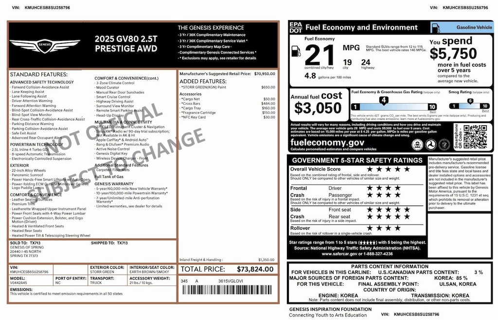 This Retired Courtesy Loaner is Genesis Certified with over 97,000 miles of Factory Warranty remaining! A CPO has more warranty than a new one; under the GENESIS CERTIFIED Program you get the remainder of the 10 YEAR/100,000 mile powertrain warranty AND IT EXTENDS THE BUMPER-TO-BUMPER WARRANTY TO 6YRS/75,000 miles from the in-service date that started on 06.30.2025. That is more than the 5/60 bumper-to-bumper warranty when it was new! You also receive; 3 years of Genesis Connected Services, 90 days XM, Rental Car Coverage, Towing & Travel Breakdown Coverage and free Roadside Assistance for 10 years. Click on ORIGINAL WINDOW STICKER on the Carfax to see all of the features. Although it is being sold as used, it has never been titled. Clean Carfax. We have both remotes. Like new inside and out. Located at 20440 Interstate I-45 North, Spring, Tx minutes from The Woodlands, Tomball and Conroe. CALL US (346-589-8830) CLICK US (GenesisofSpring.com) or COME SEE US!!