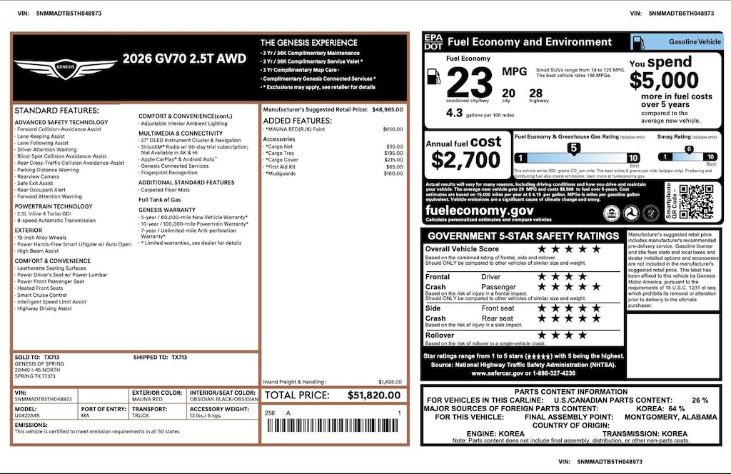 This Retired Courtesy Loaner is Genesis Certified with over 94,000 miles of Factory Warranty remaining! A CPO has more warranty than a new one; under the GENESIS CERTIFIED Program you get the remainder of the 10 YEAR/100,000 mile powertrain warranty AND IT EXTENDS THE BUMPER-TO-BUMPER WARRANTY TO 6YRS/75,000 miles from the in-service date that started on 09.30.2025. That is more than the 5/60 bumper-to-bumper warranty when it was new! You also receive; 3 years of Genesis Connected Services, 90 days XM, Rental Car Coverage, Towing & Travel Breakdown Coverage and free Roadside Assistance for 10 years. Click on ORIGINAL WINDOW STICKER on the Carfax to see all of the features. Although it is being sold as used, it has never been titled. Clean Carfax. We have both remotes. Like new inside and out. Located at 20440 Interstate I-45 North, Spring, Tx minutes from The Woodlands, Tomball and Conroe. CALL US (346-589-8830) CLICK US (GenesisofSpring.com) or COME SEE US!!
