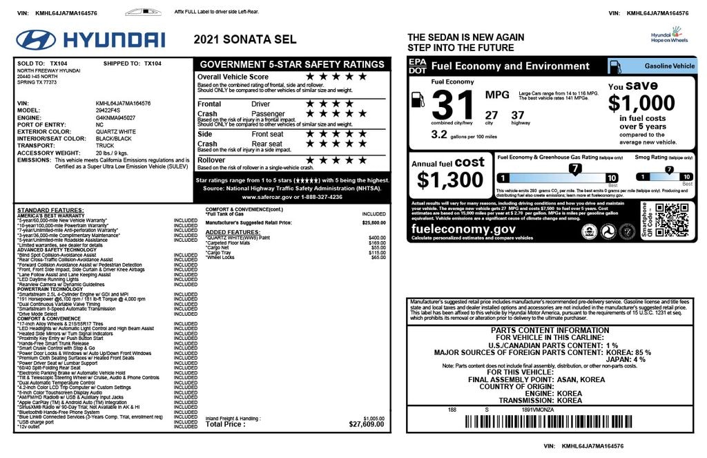 2021 Hyundai Sonata SEL with 82,612 miles, Smartstream 2.5L 4-Cylinder Engine w/ GDI and MPI, Smartstream 8-Speed Automatic Transmission. QUARTZ WHITE(White) Exterior with Black interior. Loaded with, Blind Spot Collision-Avoidance Assist, Rear Cross-Traffic Collision-Avoidance Assist see, Lane Follow Assist and Lane Keeping Assist, Rearview Camera w/ Dynamic Guidelines, Smart Cruise Control with Stop & Go, see third picture for original window sticker. 1 OWNER. Located at 18877 US-59, Humble, Tx minutes from The Woodlands, Tomball and Conroe. CALL US (832-644-4000) CLICK US (www.humblehyundai.com) or COME SEE US!! Humble, Texas.