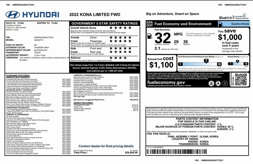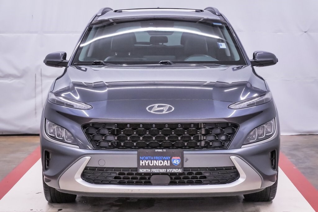 2022 Hyundai Kona Limited with 55,355 miles 1.6L 4cylinder engine and automatic transmission. Thunder Gray exterior and Ebony interior. 18" Alloy Wheels, Proximity Key w/Push Button Start, Power Sunroof, Leather Trimmed Seats, Smart Cruise Control, Rearview Monitor w/Parking Guidance, Wireless Device Charging, Android Auto, Apple Carplay, Harman Kardon Premium Audio, Dynamic Voice Recognition. Located in Spring, Texas on Interstate I-45 North minutes from The Woodlands, Tomball and Conroe. CALL US CLICK US COME SEE US 832-446-4000.