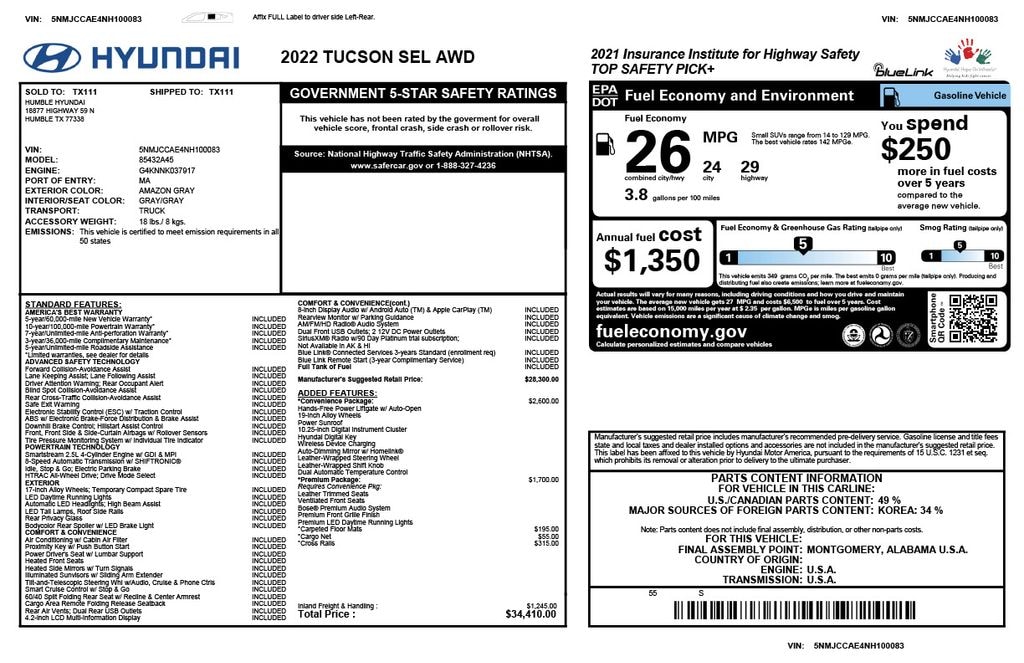 2022 Hyundai Tucson SEL with 38,152 miles, Smartstream 2.5L 4-Cylinder Engine w/ GDI & MPI, 8-Speed Automatic Transmission w/ SHIFTRONIC. AMAZON GRAY(Gray) Exterior with GRAY/GRAY interior. Loaded with, Forward Collision-Avoidance Assist, Lane Keeping Assist; Lane Following Assist, Blind Spot Collision-Avoidance Assist, Rear Cross-Traffic Collision-Avoidance Assist, Downhill Brake Control; Hillstart Assist Control, Proximity Key w/ Push Button Start, see third picture for original window sticker. CERTIFIED UNIT comes with 10 years 100,000 miles POWER TRAIN, 5 years 60,000 miles COMPREHENSIVE, and 10 year UNLIMITED MILES roadside assistance. Located at 18877 US-59, Humble, Tx minutes from The Woodlands, Tomball and Conroe. CALL US (832-644-4000) CLICK US (www.humblehyundai.com) or COME SEE US!! Humble, Texas.