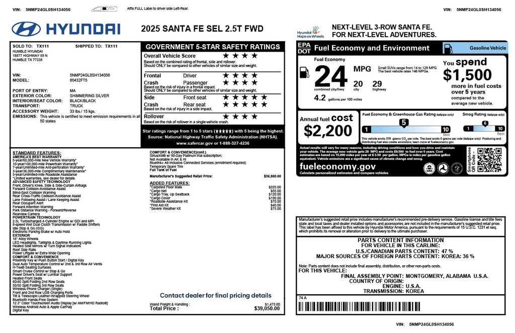2025 SANTA FE SEL 2.5T FWD w/only 13,479 miles. 2.5L Turbocharged 4-Cylinder Engine w/ GDI and MPI 8-speed Wet Dual Clutch Transmission w/ Paddle Shifters . EXTERIOR COLOR: SHIMMERING SILVER & INTERIOR: BLACK/BLACK. Loaded with Smart Cruise Control, Highway Driving Assist, Dual Automatic Temperature Control, Auto-Dimming Rearview Mirror, Limited Liftgate w/ Auto Open, MULTIMEDIA & CONNECTIVITY, 12.3" Navigation System, Android Auto & Apple CarPlay, Wireless Phone Charger, Digital Key. Way too many options to list, see third picture for original window sticker. CERTIFIED UNIT comes with 10 years 100,000 miles POWERTRAIN, 5 years 60,000 miles COMPREHENSIVE, and 10-year UNLIMITED MILES roadside assistance. Located at 18877 US-59, Humble, Tx minutes from The Woodlands, Tomball and Conroe. CALL US (832-644-4000) CLICK US (www.humblehyundai.com) or COME SEE US!! Humble, Texas.(More photos at www.HumbleHyundai.com) See Humble Hyundai's A+ rating with Better Business Bureau at www.houston.bbb.org Humble Hyundai is the only Hyundai dealership in Houston to earn the BBB's Gold Star award...six years running! Humble is also one of the very few members of the Better Business Bureau online reliability program. See more inventory at www.Humblehyundai.com This vehicle MAY include the following features. Please verify vehicle's features before purchase; Option Group 01, Hyundai Certified Used Vehicles Certified, Black Premium Synthetic, 18" x 7.5J Alloy Wheels, 3rd row seats: bench, 4-Wheel Disc Brakes, 6 Speakers, ABS brakes, Air Conditioning, Alloy wheels, AM/FM radio: SiriusXM, Apple CarPlay & Android Auto, Auto High-beam Headlights, Automatic temperature control, Brake assist, Bumpers: body-color, Cargo Cover, Cargo Net, Cargo Tray, Carpeted Floor Mats, Delay-off headlights, Driver door bin, Driver vanity mirror, Dual front impact airbags, Dual front side impact airbags, Electronic Stability Control, Emergency communication system, Exterior Parking Camera Rear, First Aid Kit, Four wheel independent suspension, Front anti-roll bar, Front Bucket Seats, Front Center Armrest, Front dual zone A/C, Front reading lights, Fully automatic headlights, H-Tex Leatherette Seat Trim, Heated door mirrors, Heated Front Bucket Seats, Heated front seats, Illuminated entry, Knee airbag, Leather steering wheel, Low tire pressure warning, Occupant sensing airbag, Outside temperature display, Overhead airbag, Overhead console, Panic alarm, Passenger door bin, Passenger vanity mirror, Power door mirrors, Power driver seat, Power Liftgate, Power steering, Power windows, Radio: AM/FM/HD Display Audio, Rear anti-roll bar, Rear seat center armrest, Rear side impact airbag, Rear window defroster, Rear window wiper, Remote keyless entry, Roadside Assistance Kit, Security system, Severe Weather Kit, Speed control, Speed-sensing steering, Split folding rear seat, Spoiler, Steering wheel mounted audio controls, Tachometer, Telescoping steering wheel, Tilt steering wheel, Traction control, Trip computer, Turn signal indicator mirrors, and Variably intermittent wiperS.