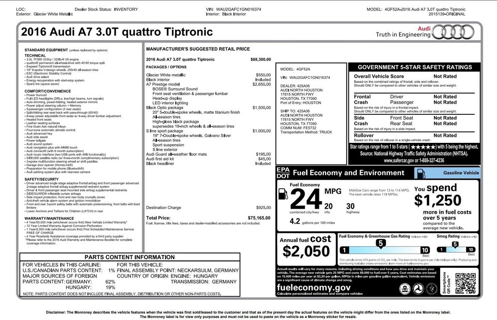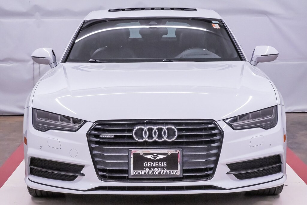 2016 Audi A7 3.0T Prestige quattro w/only 81,023 miles. 3.0L Turbo (333 hp) with a 8-speed automatic transmission. Glacier White Metallic with Black Leather interior. Loaded with Audi MMI Navigation Plus, Heads-Up Display, Sport Suspension, Heated/Cooled Front Seats, Black Optic pkg., S line Sport pkg., Moonroof, LED Interior Lighting, and 20" 5-Double-Spoke Titanium Matte Wheels. Way too many options to list see third picture for original window sticker. Located at 20440 Interstate I-45 North, Spring, Tx minutes from The Woodlands, Tomball and Conroe. CALL US (346-589-8830) CLICK US (GenesisofSpring.com) or COME SEE US!!
