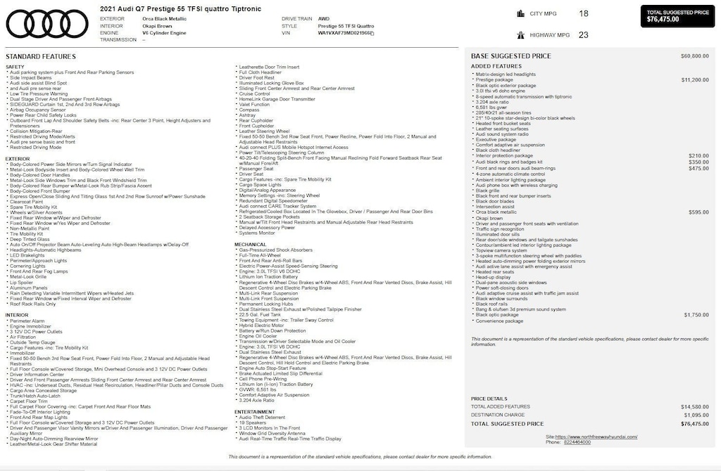 2021 Audi Q7 55 PRESTIGE quattro w/only 51,001 miles. 3.0L Turbo (335 hp) with a 8-speed automatic transmission. Orca Black Metallic with Okapi Brown Leather interior. Loaded with Prestige Pkg., Heads-Up Display, Air Suspension, Power Soft Door Closures, Bang and Olufsen 3D Premium Sound System, Black Optic Exterior Pkg., Convenience Pkg., Executive Pkg., Contour/Ambient LED Interior Lighting, Tow Pkg., Audi Beam Rings, and 21" 10-Spoke Star Design Wheels. Way too many options to list see third picture for original window sticker. Clean Carfax! All four tires have 11/32 tread with DOT date codes of 44/23. Located at 20440 Interstate I-45 North, Spring, Tx minutes from The Woodlands, Tomball and Conroe. CALL US (346-589-8830) CLICK US (GenesisofSpring.com) or COME SEE US!!