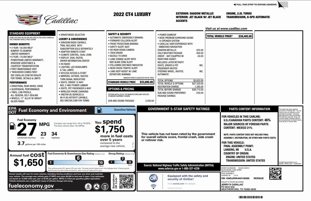 2022 Cadillac CT4 Luxury with 75,411 miles 2.0L Turbo engine and automatic transmission. Cold Weather Package, Sun and Sound Package, Power Sunroof, Bose Premium Surround Sound, Rear Park Assist, 17" Alloy Wheels, Wireless Phone Charging, Remote Start, Keyless Access & Start, HD Rear Vision Camera, WI-FI Hotspot Capable. One Owner! Located in Spring, Texas on Interstate I-45 North minutes from The Woodlands, Tomball and Conroe. CALL US CLICK US COME SEE US 832-446-4000.