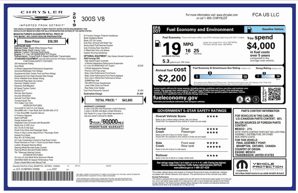 2019 Chrysler 300 S V8 w/only 77,930 miles. 5.7L V8 (363 hp) with a 8-speed automatic transmission. Bright White with Black Leather interior. Loaded with High Speed Engine Controller, Duel Pane Panoramic Sunroof, Remote Start, Uconnect 4C 8.4-Inch Display, Apple/Android Carplay, Heated Front Seats, and 20" Black Noise Aluminum Wheels. Way too many options to list see third picture for original window sticker. Clean Carfax! Located at 20440 Interstate I-45 North, Spring, Tx minutes from The Woodlands, Tomball and Conroe. CALL US (346-589-8830) CLICK US (GenesisofSpring.com) or COME SEE US!!
