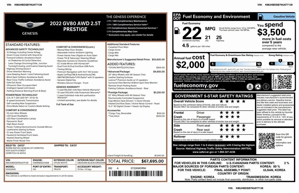 2022 GV80 Prestige with 31,334 miles 2.5T engine and 8 speed automatic transmission. Advanced Package, Prestige Package, 22" Alloy Wheels, Leather Seating Surfaces, Lexicon Premium Audio w/21 Speakers, Surround View Monitor, Remote Smart Parking, 12.3" 3D Digital Cluster, Heads Up Display, Wireless Device Charging, Panoramic Sunroof, Heated & Ventilated Front Seats, Premium Navigation with 14.5" HD Touchscreen, Android Auto, Apple Carplay. Clean Carfax! Warranty Start 12/10/2021 with over 13 months of bumper to bumper warranty remaining. Located in Spring, Texas on Interstate I-45 North minutes from The Woodlands, Tomball and Conroe. CALL US CLICK US COME SEE US 832-446-4000.