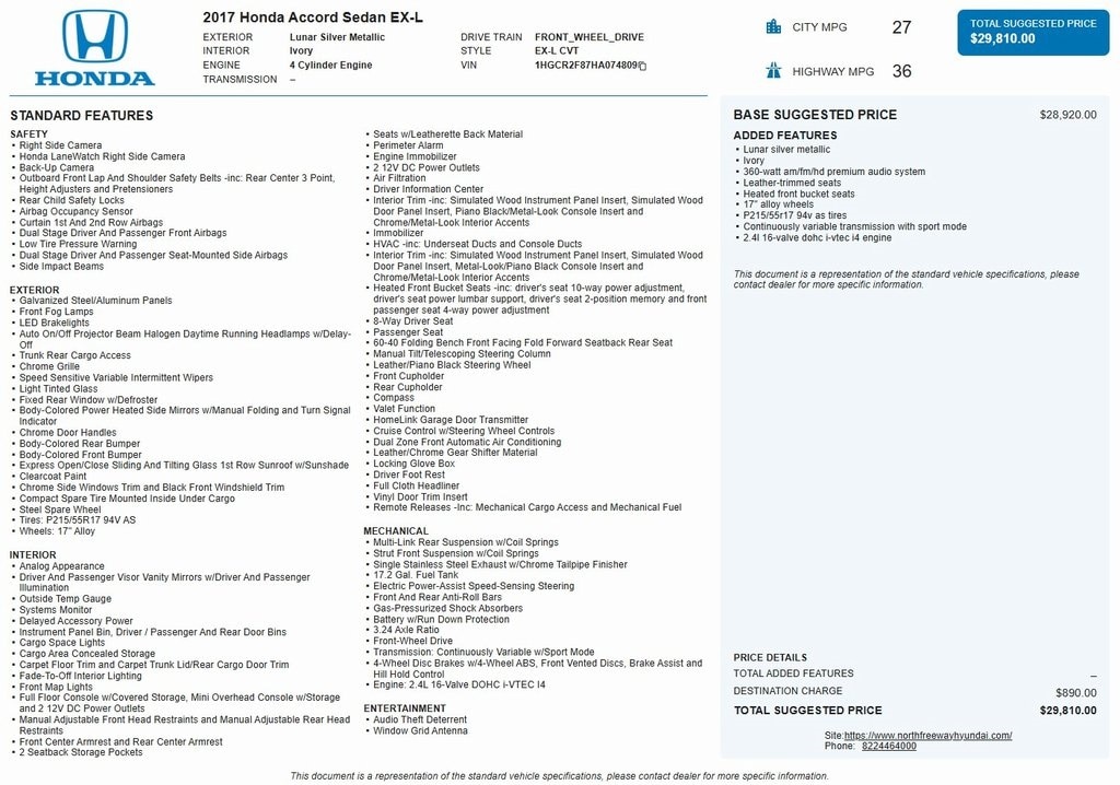 2017 Honda Accord EX-L with 90,467 miles 2.4L 4cylinder engine and automatic transmission. Lunar Silver Metallic exterior and Ivory interior. 17" Alloy Wheels, Leather Trimmed Seats, Heated Front Bucket Seats, Back Up Camera, Right Side Camera, Perimeter Alarm, 8-Way Driver Seat, Compact Spare Tire Mounted Inside Under Cargo. Clean Carfax! Located in Spring, Texas on Interstate I-45 North minutes from The Woodlands, Tomball and Conroe. CALL US CLICK US COME SEE US 832-446-4000.