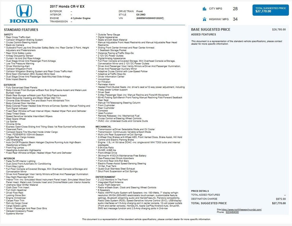 2017 Honda CR-V EX w/only 95,613 miles. 1.5L Turbo (190 hp) with a automatic transmission. Obsidian Blue Peral with Gray Cloth interior. Loaded with Power Sliding Sunroof, 7-Inch Touchscreen Display, Power/Heated Front Seats, Duel-Zone Climate Control, Fog Lights, Back-Up Camera, Blind Spot Information, Collision Mitigation Front and Rear w/Cross Traffic Alert and 18" Wheels. Way too many options to list see third picture for original window sticker. All four tires have 7/32 tread with DOT date codes of 15/24. Located at 20440 Interstate I-45 North, Spring, Tx minutes from The Woodlands, Tomball and Conroe. CALL US (346-589-8830) CLICK US (GenesisofSpring.com) or COME SEE US!!