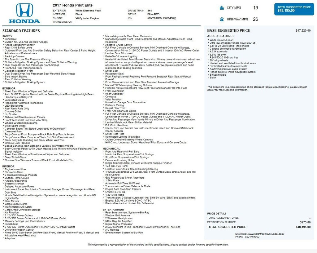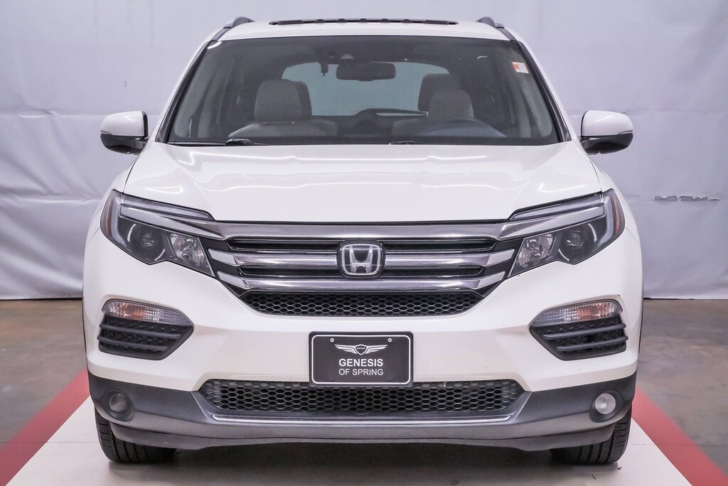 2017 Honda Pilot Elite AWD w/only 65,875 miles. 3.5L (280 hp) with a 9-speed automatic transmission. Diamond White Pearl with Black Leather interior. Loaded with Honda Satellite-Linked Navigation, Premium Audio, Sirius XM, Heated and Ventilated Front Bucket Seats, Honda Sensing Safety Suite, Panoramic Sunroof, Rear Entertainment, and Apple/Android Carplay. Way too many options to list see third picture for original window sticker. Clean Carfax! All four tires have 8/32 tread with DOT date codes of 40/23. Located at 20440 Interstate I-45 North, Spring, Tx minutes from The Woodlands, Tomball and Conroe. CALL US (346-589-8830) CLICK US (GenesisofSpring.com) or COME SEE US!!