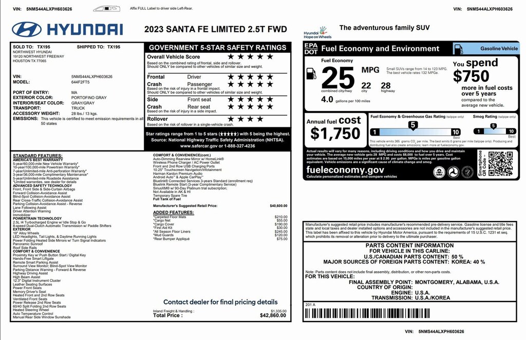 We replaced our Lexus GX460 & BMW 330i X-drive with this ‘22 Santa Fe Calligraphy and could not be happier. Drives much like the BMW without the turbo lag the 330 had. Tech blows away the GX. Can honestly say that it is my favorite car that I have ever owned. I had ordered a new Tesla Model Y and after looking at the Calligraphy found it far better looking inside and outside. HUD is my favorite feature and it is not even offered on the Tesla. The $10k I saved buying the Santa Fe over the Y will buy my gas for the next 70000 miles… Who needs the limits of electric…… - 5.0