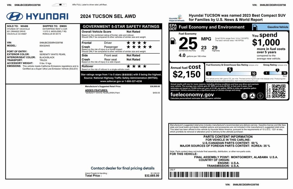 2024 Hyundai Tucson SEL AWD with 63,989 miles 2.5L 4cylinder engine and automatic transmission. Serenity White Pearl exterior and Ebony interior. 17" Alloy Wheels, Proximity Key w/Push Button Start, Smart Cruise Control, Heated Front Seats, Hands Free Smart Power Liftgate, Wireless Phone Charger, Android Auto, Apple Carplay, Hyundai Digital Key, 8" Touchscreen Display. One Owner! Minor On Carfax! Located in Spring, Texas on Interstate I-45 North minutes from The Woodlands, Tomball and Conroe. CALL US CLICK US COME SEE US 832-446-4000.