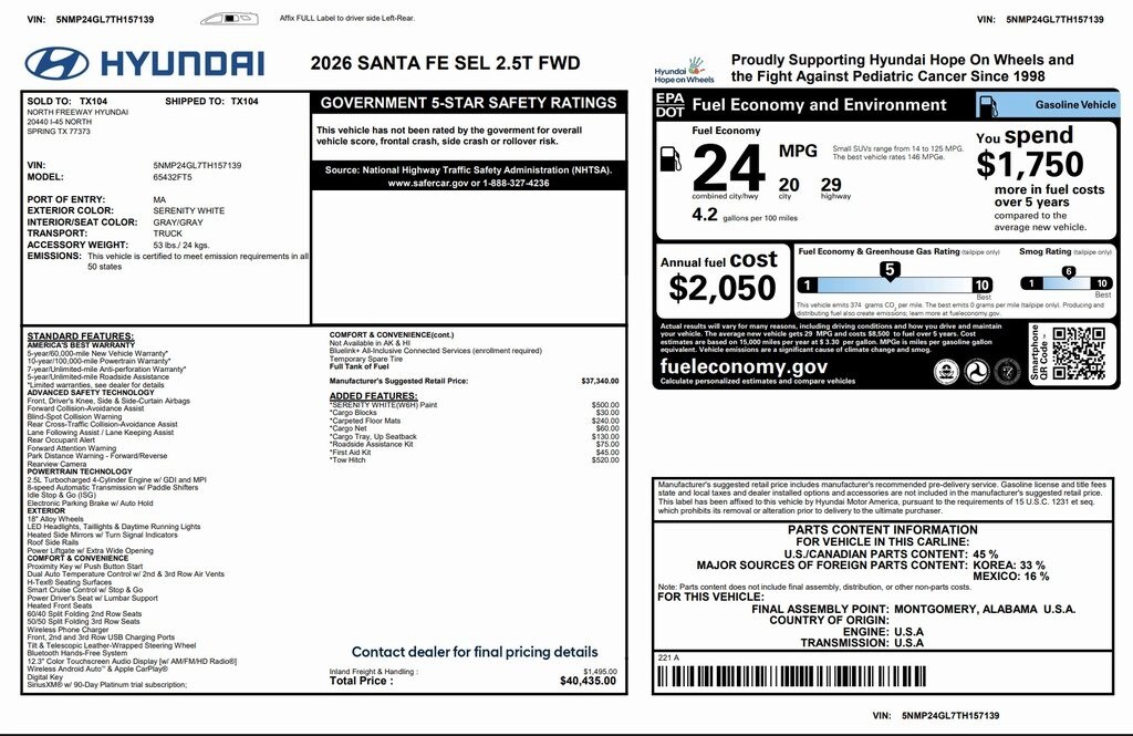 2026 Hyundai Santa Fe SEL with 1,294 miles 2.5L 4cylinder engine and automatic transmission. Serenity White exterior and Gray interior. 18" Alloy Wheels, Proximity Key w/Push Button Start, Smart Cruise Control, Wireless Phone Charging, H-Tex "Leatherette" Seating Surfaces, Bluetooth Hands Free System, 12.3" Color Touchscreen Display, Wireless Android Auto & Apple Carplay, Hyundai Digital Key, One Owner! Clean Carfax! Warranty Start Date 08/09/2025 with over 57 months of bumper to bumper and over 117 months of powertrain warranty remaining. Located in Spring, Texas on Interstate I-45 North minutes from The Woodlands, Tomball and Conroe. CALL US CLICK US COME SEE US 832-446-4000.