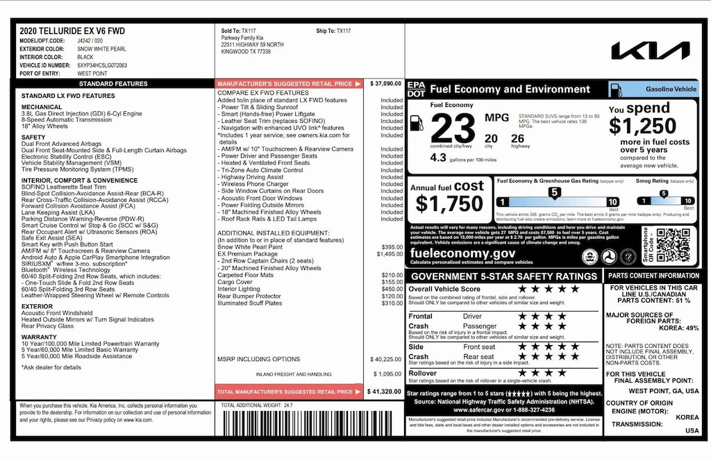 2020 Kia Telluride EX Premium w/only 87,775 miles. 3.8L 6-Cylinder (291 hp) with a 8-speed automatic transmission. Snow White Pearl with Black Leather interior. Loaded with Power sunroof, 10" Touchscreen Navigation, Power/Heated/Cooled Front Seats, 2nd Row Captians Charis, Wireless Charging Pad, Tri-Zone Climate Control, Smart (hands free) Liftgate and 20" Wheels. Way too many options to list see third picture for original window sticker. Clean Carfax! All four tires have 7/32 tread. Located at 20440 Interstate I-45 North, Spring, Tx minutes from The Woodlands, Tomball and Conroe. CALL US (346-589-8830) CLICK US (GenesisofSpring.com) or COME SEE US!!