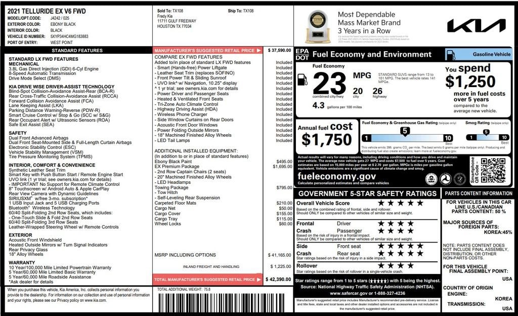 2021 Kia Telluride EX features a 3.8L Gas Direct Injection (GDI) 6-Cyl Engine with a Towing Package ($795 option) and a EX premium Package ($1,695 option)!
