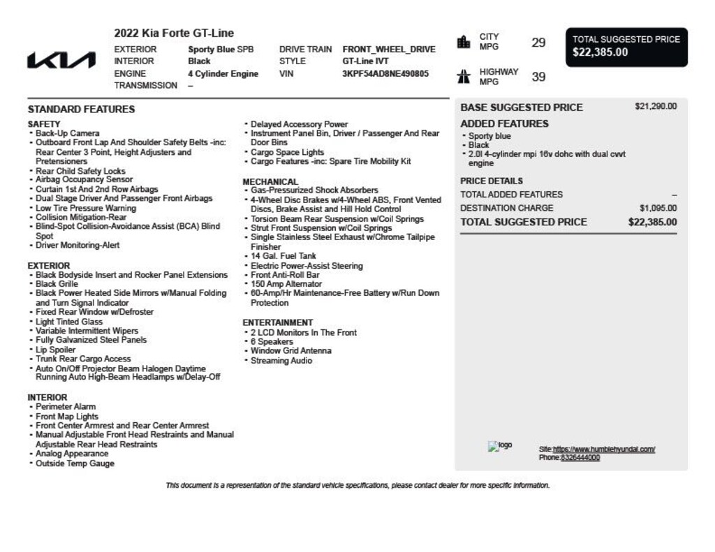 2022 Kia Forte GT-Line 2.0L 4-Cylinder MPI CVT FWD Sporty Blue ***NEW ARRIVAL!!!***