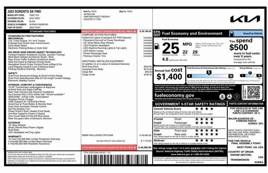 I got the 2022 Sorento for myself after we bought a 2021 Telluride for my wife. Our Sorento is the SX-Prestige, AWD X-Line version. I love the safety features -active lane keeping assist, adaptive cruise control, active assist braking, collision monitoring and more- and the 360 degree cameras are a great feature when getting in or out of tight spaces. The 2.5L turbo is very impressive, with lots of power and torque, and the handling is fantastic, especially around corners at fast speed. This feels more solid on cornering than the 2018 Tiguan I had, which was much lower to the ground. The mileage is good for an AWD, at 22 city and 27 highway. The cargo space is great, especially if you drop the third row -very easy- which allows for tons of shopping/grocery bags or luggage. I love the design, as well, which takes many cues from the bigger Telluride. The 100,000 mile limited powertrain warranty gives me comfort, as does the bumper to bumper 60k warranty. My previous Ford Escape was half that for bumper to bumper, and only 60k for powertrain, and the transmissionAND the turbo both went out at 60k. Scary! Kia has been on a great streak with quality and design. Can't wait to see how these perform over the years, but my confidence is high. The 2022 Sorento has memory seats, which was missing from the 2021 model and is a great feature when you have multiple drivers. There are some things the Sorento lacks that the Telluride has, and which are available in other countries but not on a North American Sorento. The most notable is the heads-up display, which I find to be a great safety feature on the Telluride. Blind spot monitoring, distance to the car in front, speed, they're all displayed in the heads-up unit -but not available on North American Sorentos. Also missing are hood struts -you have to use a manual prop to hold the hood open, despite hood struts being on Sorentos in other markets. Who knows, maybe they had to trim weight for mileage regulations.…