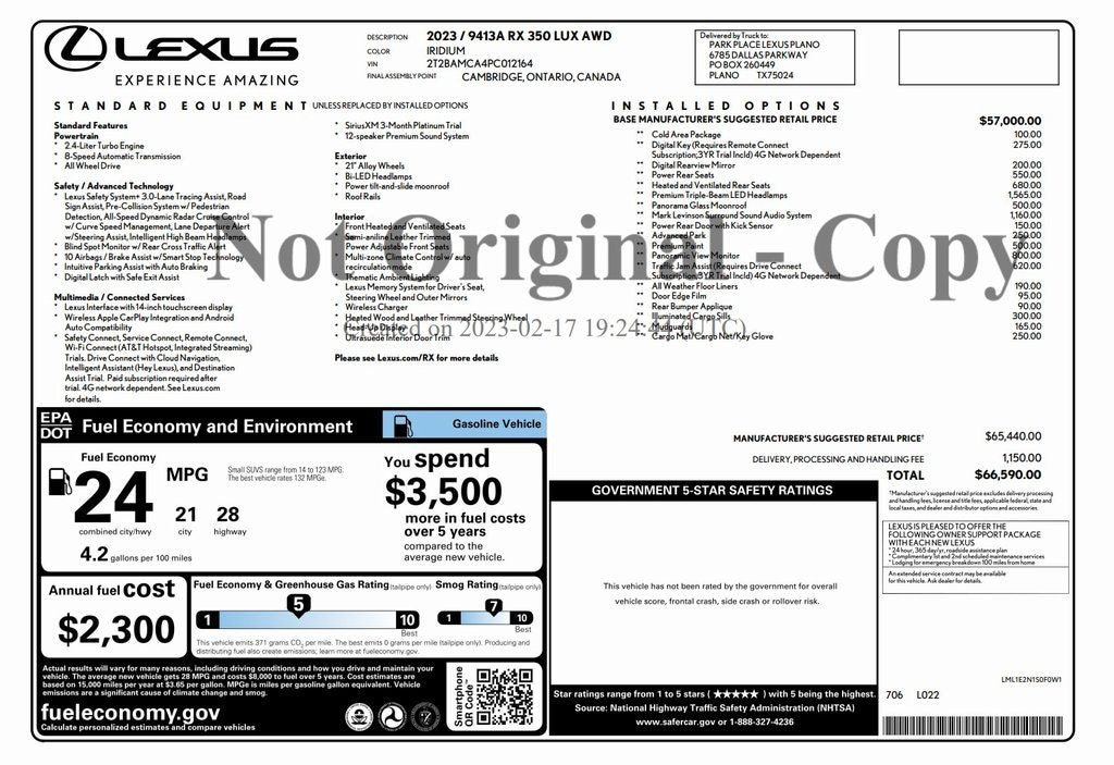2023 Lexus RX350 Premium AWD with 50,871 miles 2.4L 4cylinder engine and automatic transmission. Iridium exterior and Ebony interior. Cold Area Package, Digital Key, Digital Rearview Mirror, Heated and Ventilated Rear Seats, Panoramic Glass Moonroof, Mark Levinson Surround Sound Audio, Panoramic View Monitor, 21" Alloy Wheels, Wireless Charger, Wireless Apple Carplay and Android Auto. One Owner! Clean Carfax! Located in Spring, Texas on Interstate I-45 North minutes from The Woodlands, Tomball and Conroe. CALL US CLICK US COME SEE US 832-446-4000.