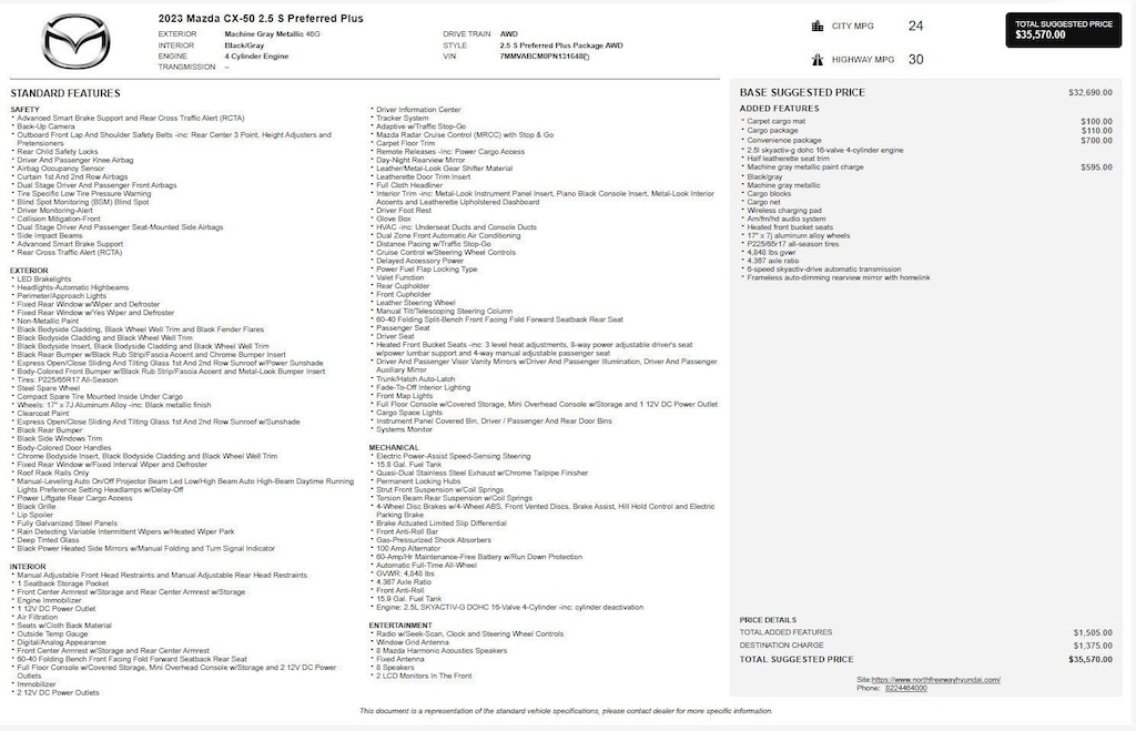 2023 Mazda CX-50 2.5 S Preferred Plus Package w/only 75,430 miles. Skyactiv-G 2.5L w/Cylinder Deactivation (187 hp) with a 6-speed automatic transmission. Machine Gray Metallic with Black Leatherette interior. Loaded with Convenience Pkg., Wireless Charging Pad, 10.25" Color Center Display, Rear Camera, Power Liftgate, Heated Front Seats, Smart Brake Support, Blind Spot Monitoring, and Wireless Apple/Android Carplay. Way too many options to list see third picture for original window sticker. Clean Carfax! All four tires have 7/32 tread with DOT date codes of 17/24. Located at 20440 Interstate I-45 North, Spring, Tx minutes from The Woodlands, Tomball and Conroe. CALL US (346-589-8830) CLICK US (GenesisofSpring.com) or COME SEE US!!