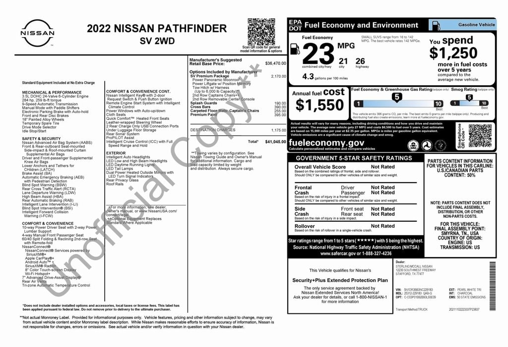 2022 Nissan Pathfinder SV with 52,768 miles 3.5L v6 engine and automatic transmission. Pearl White Tricoat exterior and Charcoal interior. SV Premium Package, Panoramic Roof, Power Liftgate, 2nd Row Captains Chair, Tow Hitch w/Harness, Push Button Ignition, ProPilot Assist, Apple Carplay, Android Auto, 8" Touchscreen Display. Located in Spring, Texas on Interstate I-45 North minutes from The Woodlands, Tomball and Conroe. CALL US CLICK US COME SEE US 832-446-4000.
