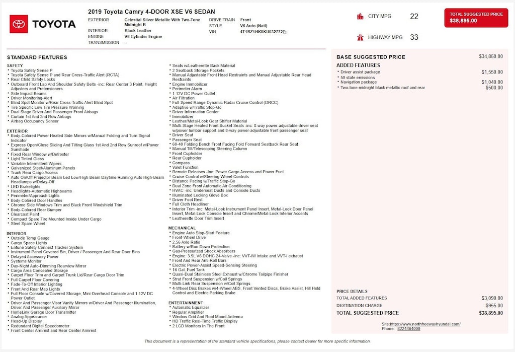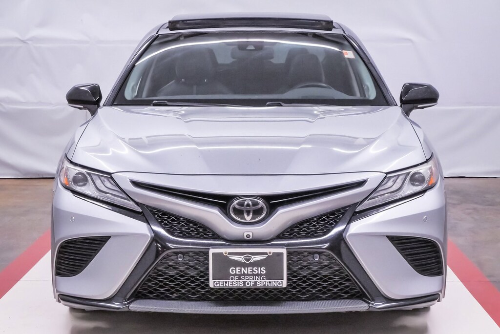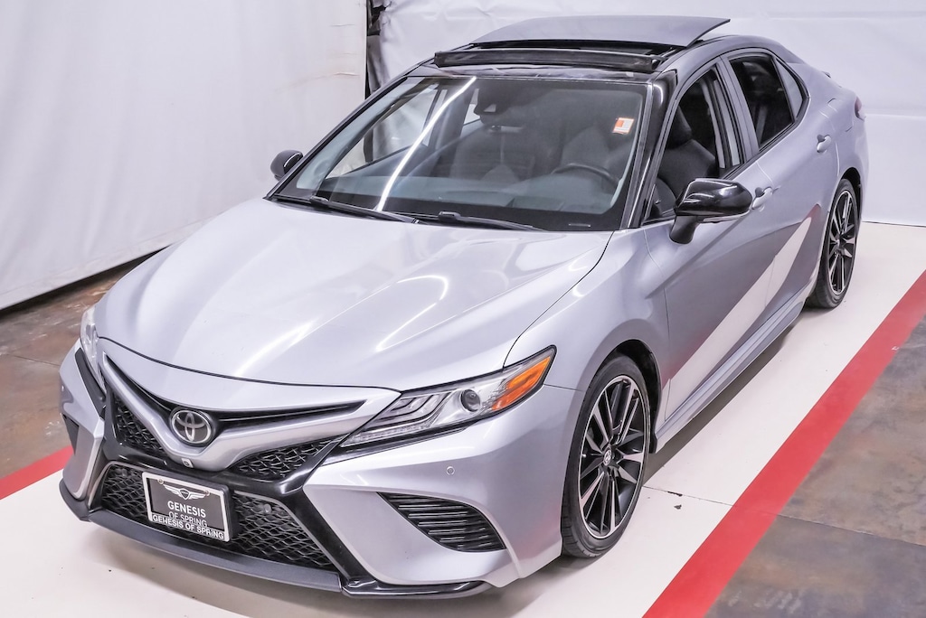 2019 Toyota Camry XSE V6 w/only 71,075 miles. 3.5L V6 (301 hp) with a 8-speed automatic transmission. Celestial Silver Metallic w/ Two-tone Midnight Black with Black Leather interior. Loaded with Navigation Pkg., Driver Assist Pkg., Power Sunroof, Heads-Up Display, Toyota Safety Sense P and Rear Cross-Traffic Alert, Dual Zone Front Automatic Air Conditioning, Distance Pacing w/Traffic Stop-Go. Way too many options to list see third picture for original window sticker. Clean Carfax! All four tires have 8/32 tread. Located at 20440 Interstate I-45 North, Spring, Tx minutes from The Woodlands, Tomball and Conroe. CALL US (346-589-8830) CLICK US (GenesisofSpring.com) or COME SEE US!!