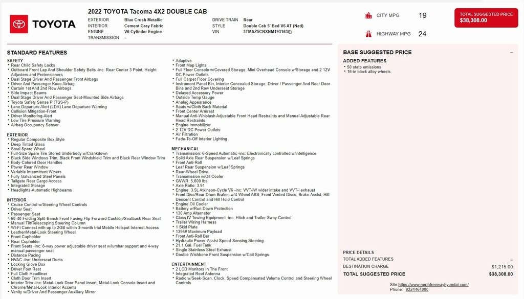 2022 Toyota Tacoma SR5 4D Double Cab with 36,738 miles 3.5L v6 engine and automatic transmission. Blue Crush Metallic exterior and Cement Gray interior. Back Up Camera, Running Boards, Lane Departure Warning, GVWR 5,600 LBS, Trailer Wiring Harness, 1395# Maximum Payload. One Owner! Clean Carfax! Located in Spring, Texas on Interstate I-45 North minutes from The Woodlands, Tomball and Conroe. CALL US CLICK US COME SEE US 832-446-4000.